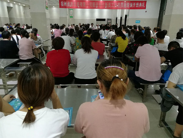 宿州盈德服装有限公司服装制作新员工岗前技能培训班开班典礼于2018年6月12日下午18时30分在盈德服装公司隆重举行。开班典礼由宿马园区人力资源服务中心副主任姜勇主持,姜勇副主任首先介绍参加此次开班典礼的领导,宿州市人力资源社会保障局职业能力建设科蒋永新科长和张欣科长:宿马工业园区人力资源服务中心梁枢主任;宿州东润职业培训学校张立今院长和李群部长;宿州盈德服装有限公司王红娟厂长和二百多名职工。